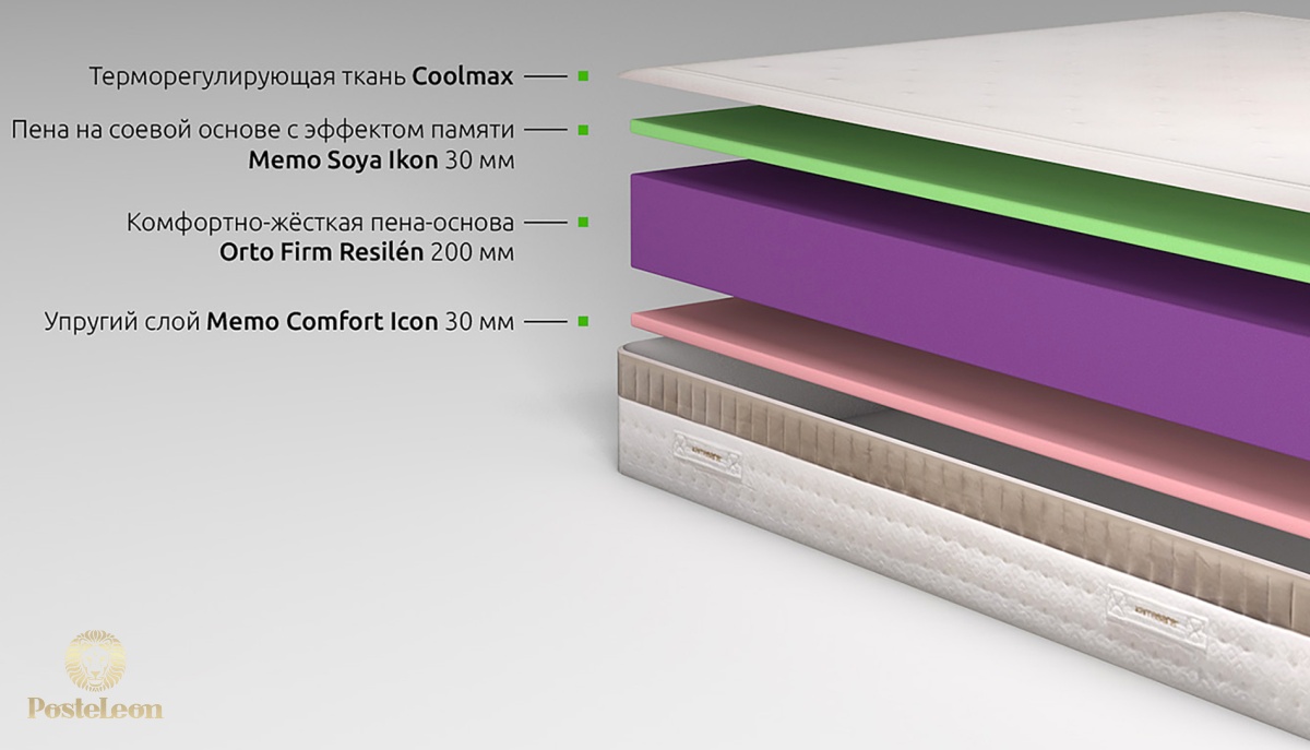 - Наполнение: пена Memo Soya Ikon® c эффектом памяти; пена Memo Comfort Ikon® c эффектом памяти; упругая пена-основа Orto Firm Bassic®;