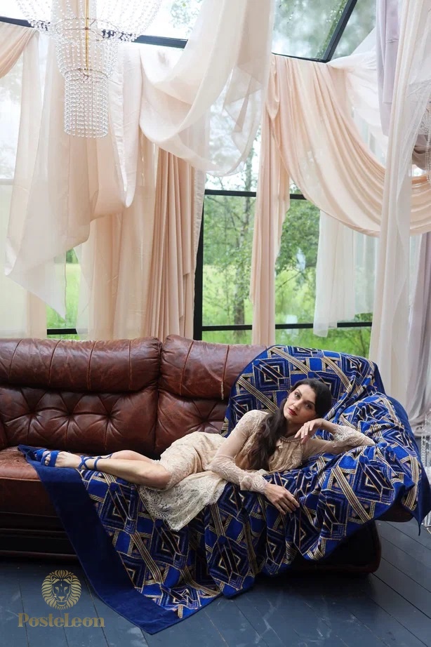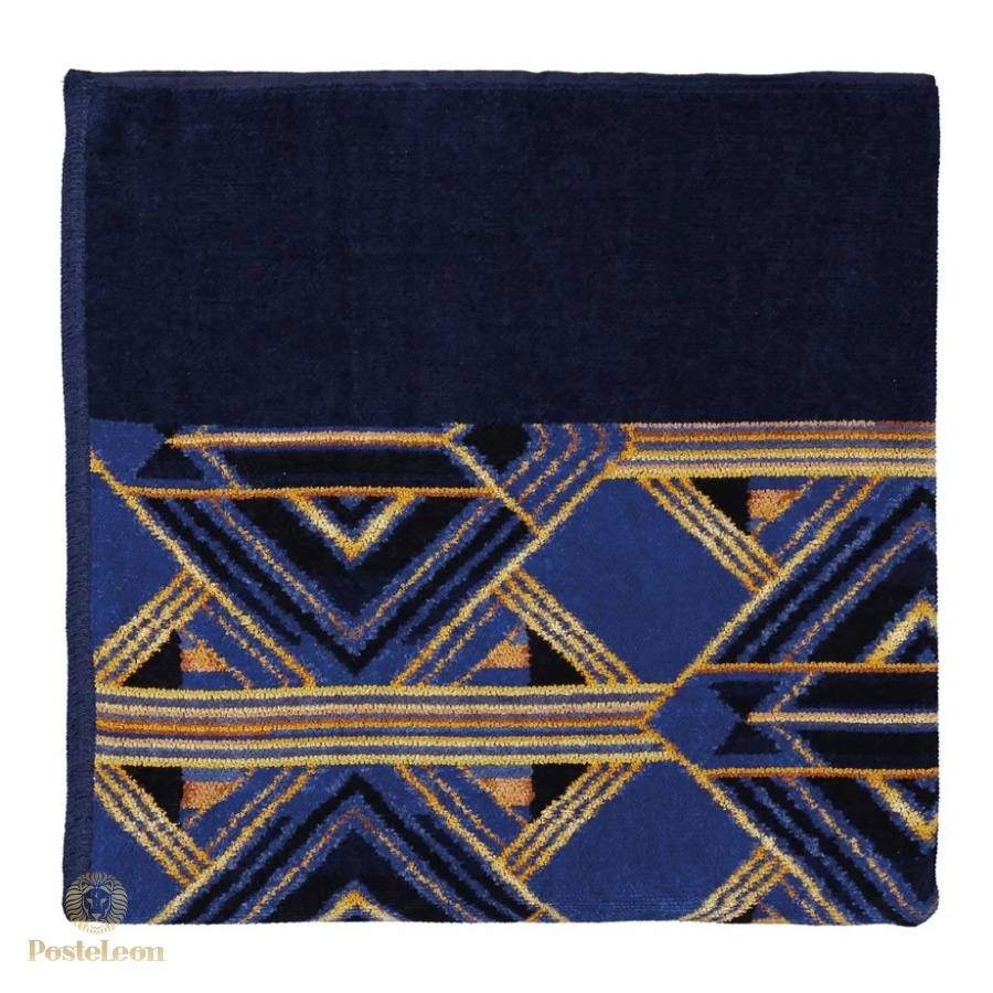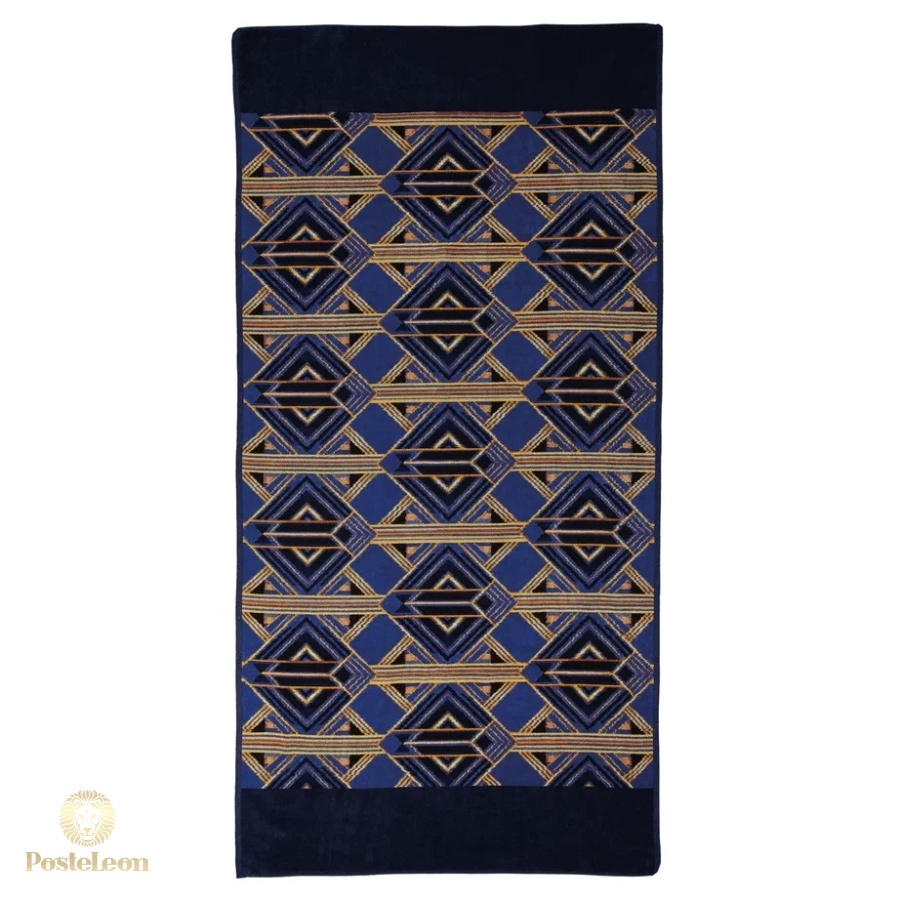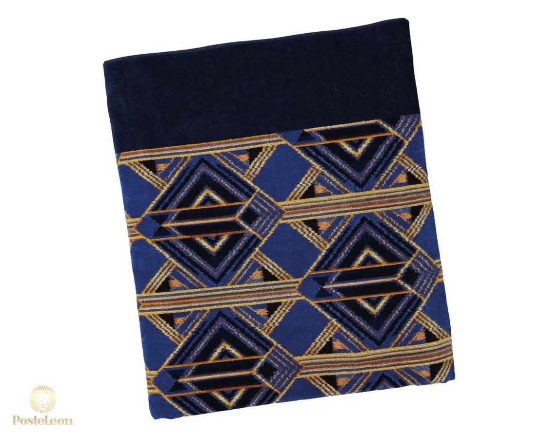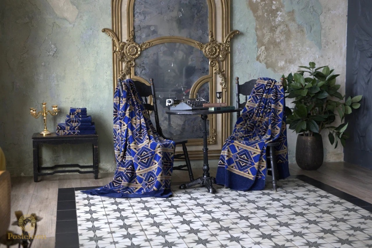 Плед-покрывало из пестротканого шенилла Gatsby выполнено в синих тонах с золотым геометрическим узором.