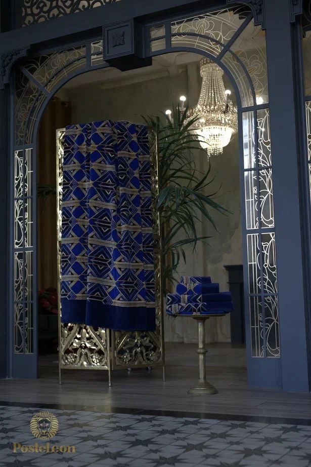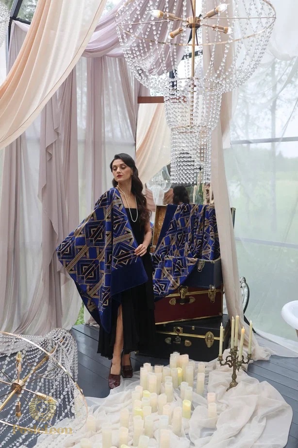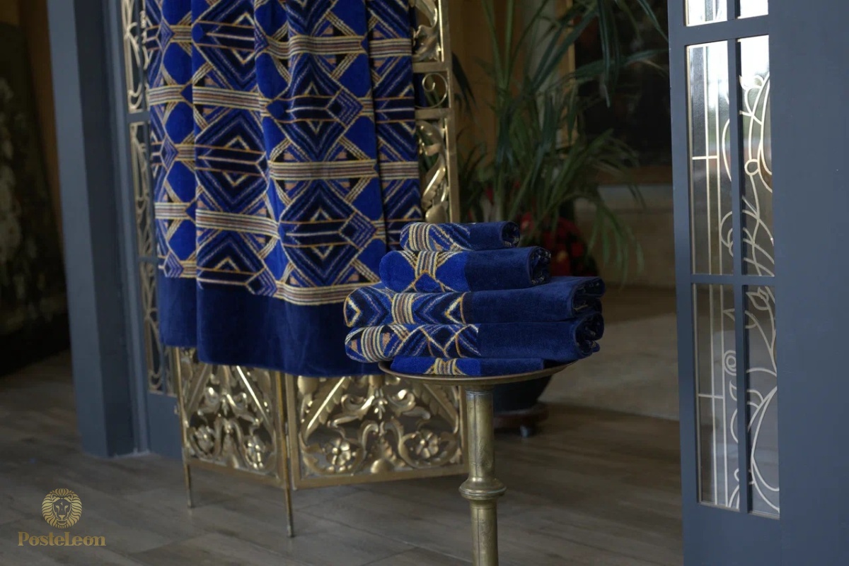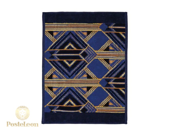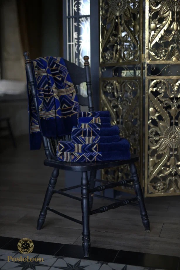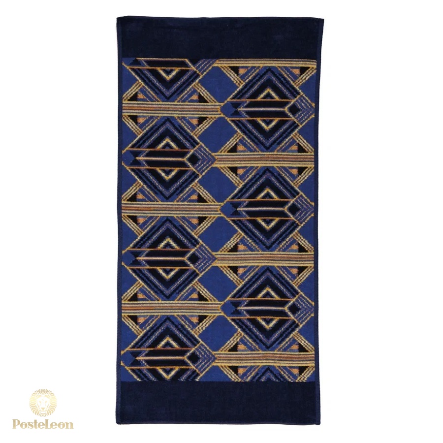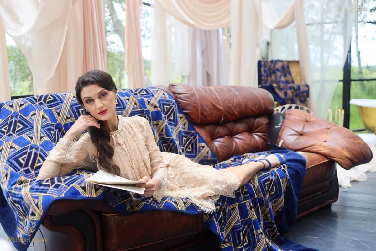 Плед-покрывало из пестротканого шенилла Gatsby выполнено в синих тонах с золотым геометрическим узором.