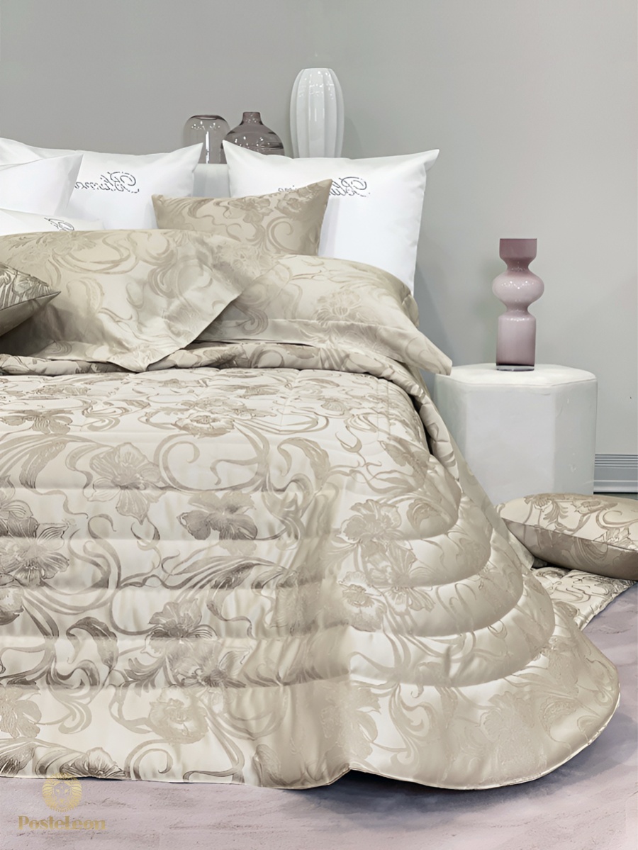 Коллекция Blumarine осень-зима 2025-2026! Очень красивое стеганое покрывало для двуспальной кровати из жаккарда с люрексом, украшено логотипом Blumarine и закруглёнными углами.