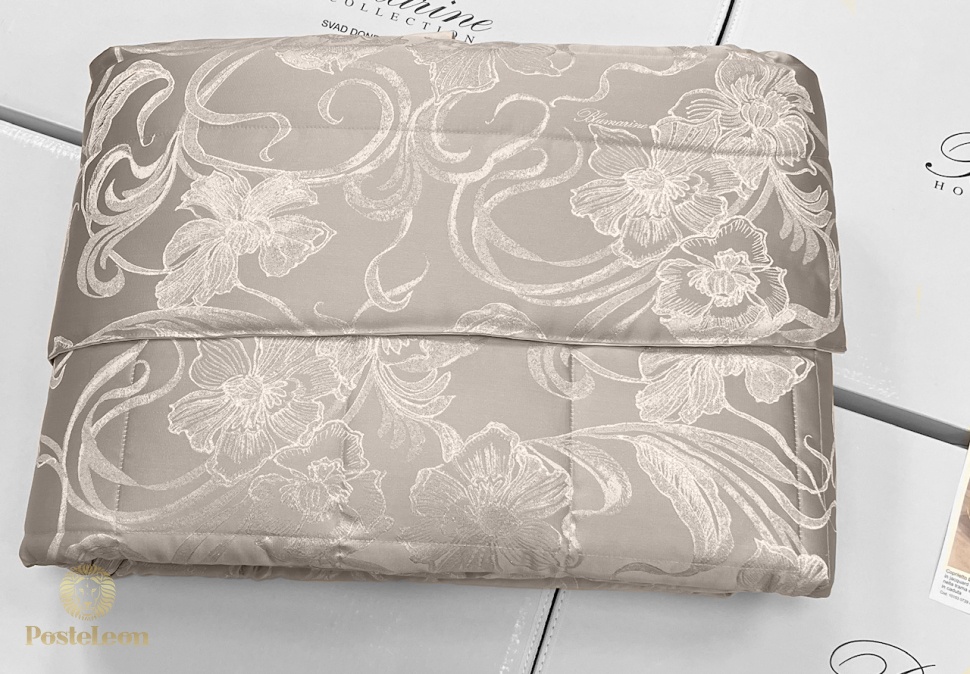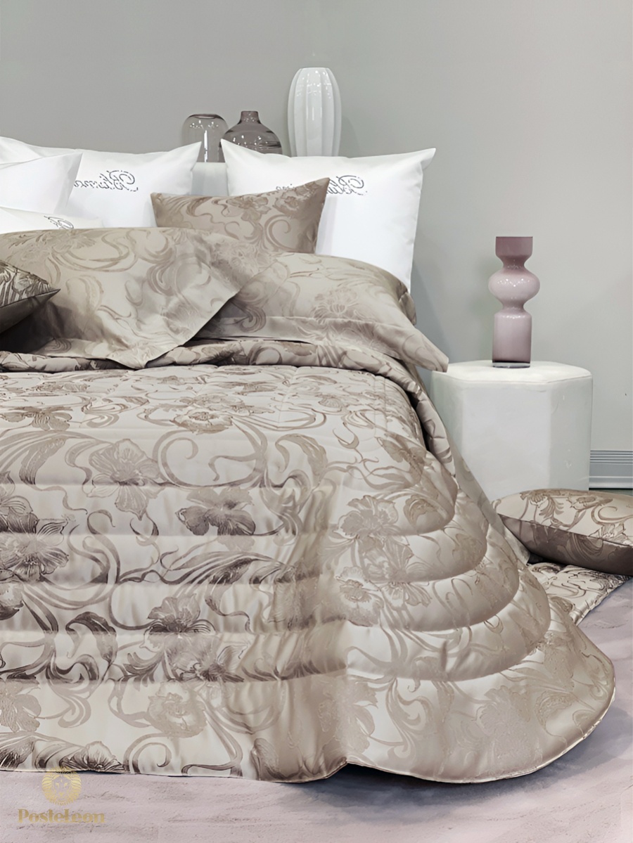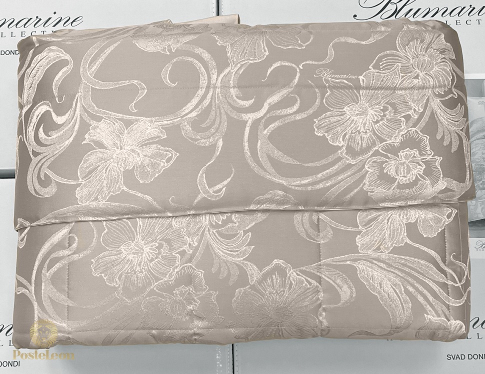 Коллекция Blumarine осень-зима 2025-2026! Очень красивое стеганое покрывало для двуспальной кровати из жаккарда с люрексом, украшено логотипом Blumarine и закруглёнными углами.