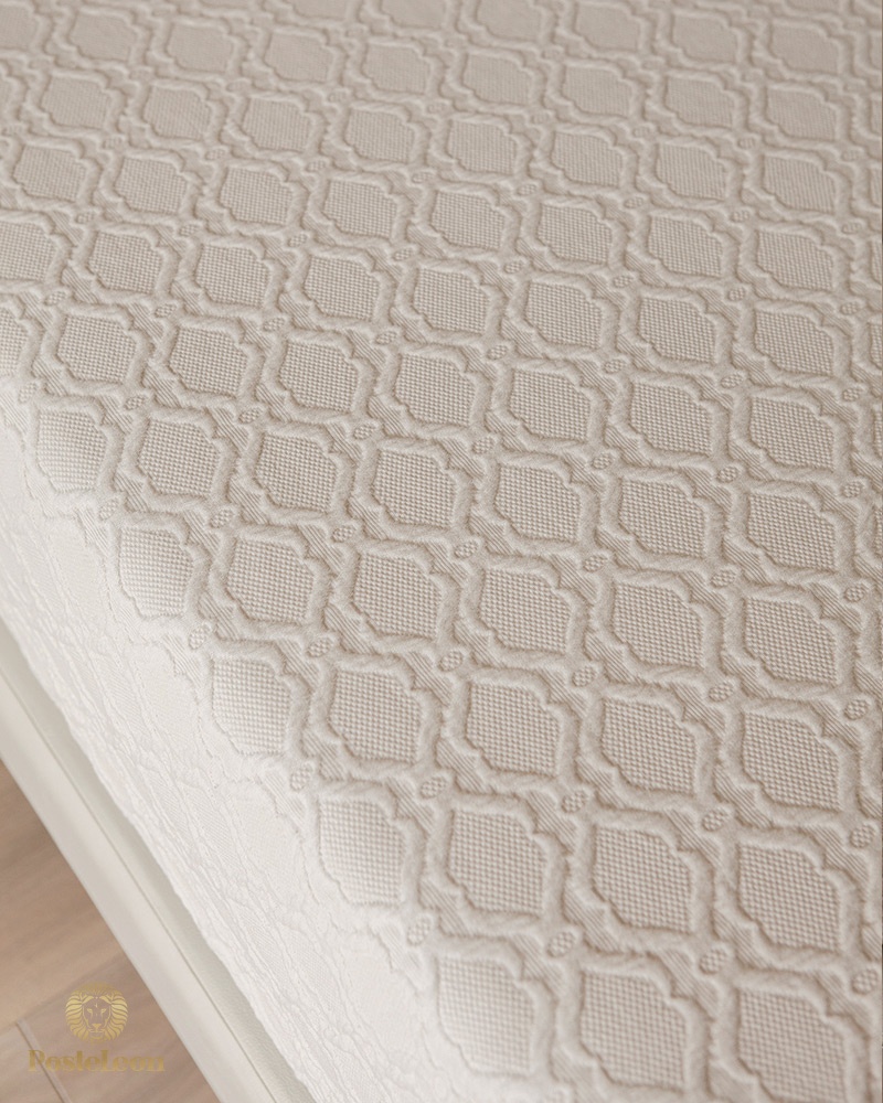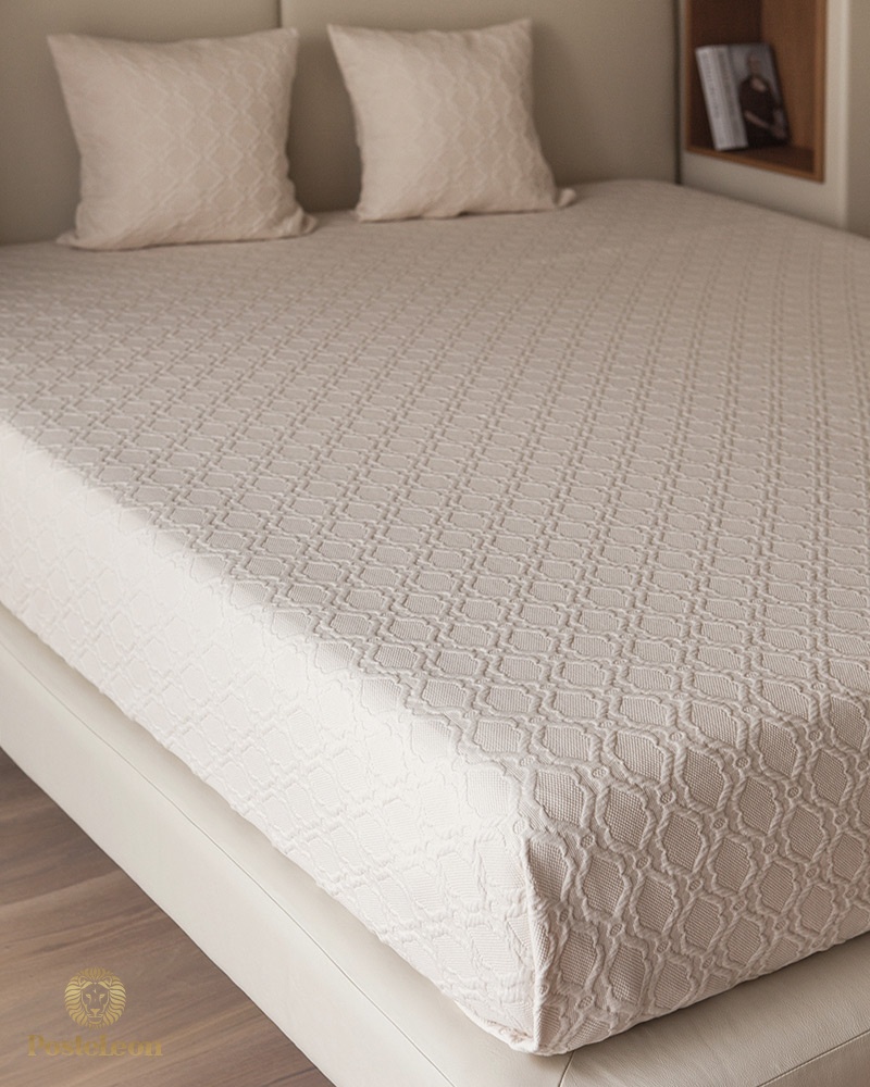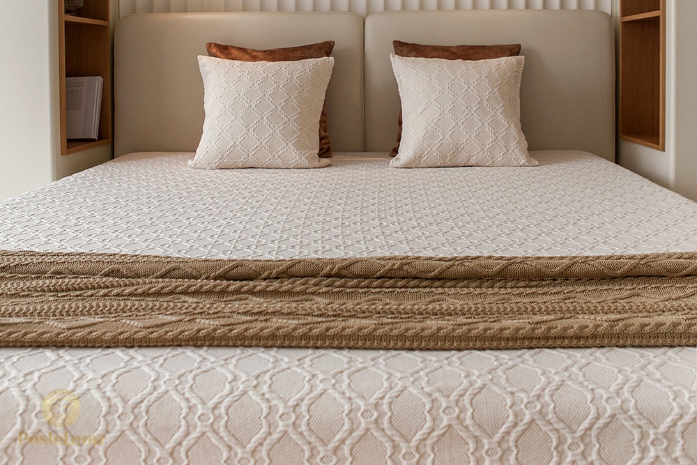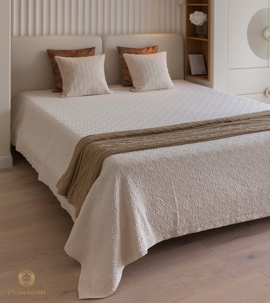 Покрывала Edinburg будут хорошо смотреться и в заправленном виде и со свободным краем. С трех сторон край завершает аккуратная отстрочка, два угла в изножье оформлены лаконичным "евроуглом". Ткань плотная, приятная на ощупь, с красивой фактурой в виде элегантных чуть выпуклых ромбов.