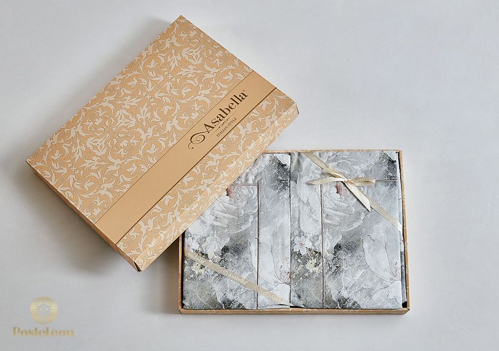 Пододеяльник этого КПБ Asabella застёгивается на молнию, наволочки - с клапаном. Комплект упакован в фирменную подарочную коробку и вложен в фирменный пакет Asabella.