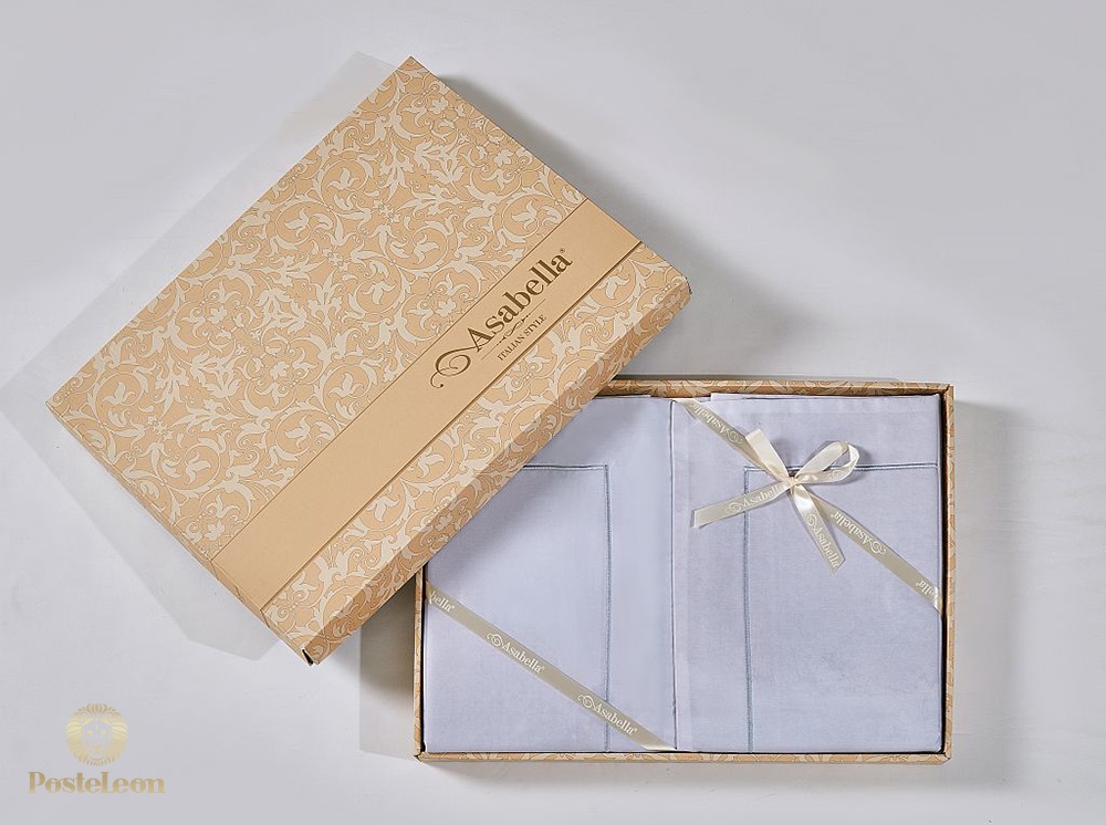 Пододеяльник этого КПБ Asabella застёгивается на молнию, наволочки - с клапаном. Комплект упакован в фирменную подарочную коробку и вложен в фирменный пакет Asabella.