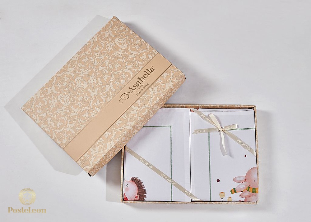 Пододеяльник этого КПБ Asabella застёгивается на молнию, наволочки - с клапаном. Комплект упакован в фирменную подарочную коробку и вложен в фирменный пакет Asabella.