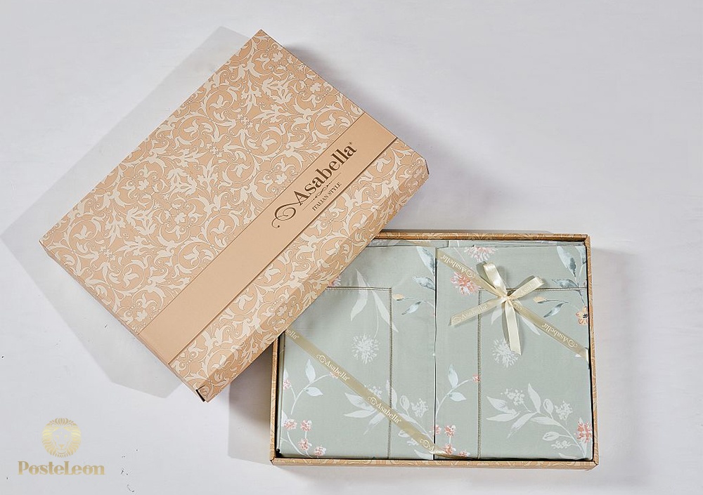 Пододеяльник этого КПБ Asabella застёгивается на молнию, наволочки - с клапаном. Комплект упакован в фирменную подарочную коробку и вложен в фирменный пакет Asabella.