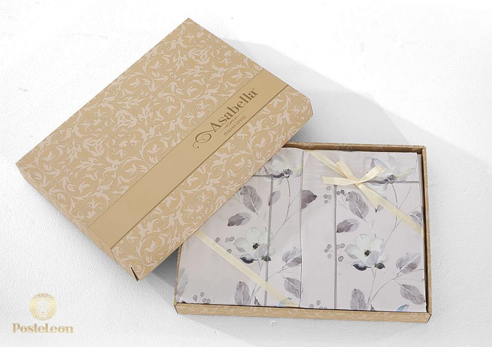 Пододеяльник этого КПБ Asabella застёгивается на молнию, наволочки - с клапаном. Комплект упакован в фирменную подарочную коробку и вложен в фирменный пакет Asabella.