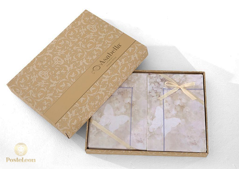 Пододеяльник этого КПБ Asabella застёгивается на молнию, наволочки - с клапаном. Комплект упакован в фирменную подарочную коробку и вложен в фирменный пакет Asabella.
