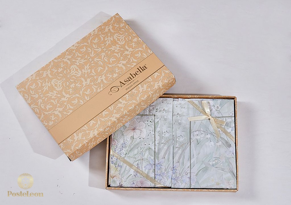 Пододеяльник этого КПБ Asabella застёгивается на молнию, наволочки - с клапаном. Комплект упакован в фирменную подарочную коробку и вложен в фирменный пакет Asabella.