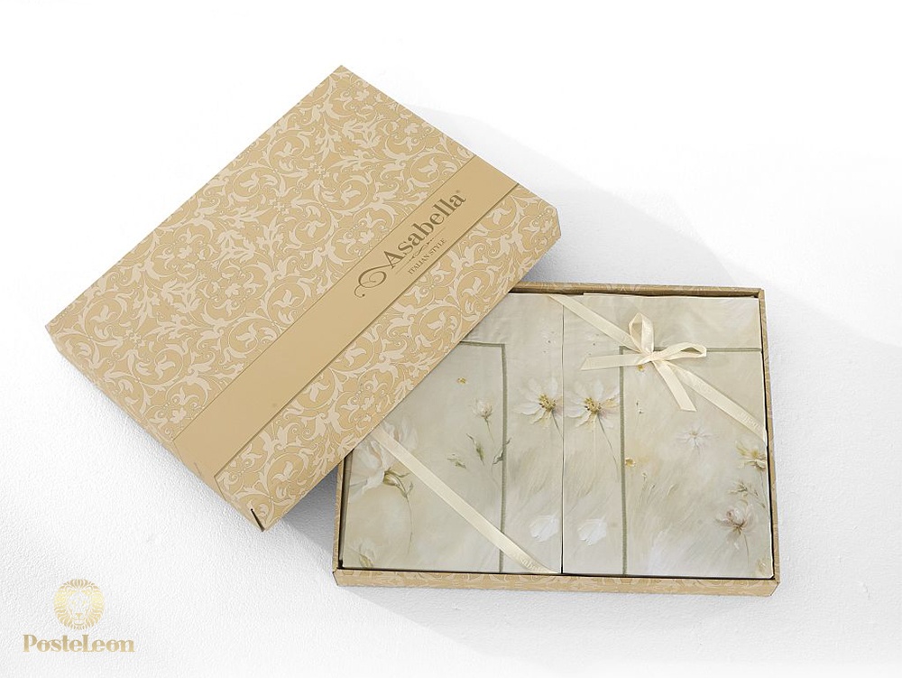 Пододеяльник этого КПБ Asabella застёгивается на молнию, наволочки - с клапаном. Комплект упакован в фирменную подарочную коробку и вложен в фирменный пакет Asabella.