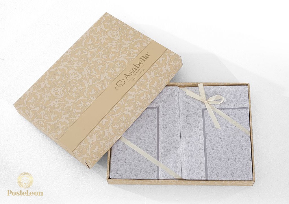 Пододеяльник этого КПБ Asabella застёгивается на молнию, наволочки - с клапаном. Комплект упакован в фирменную подарочную коробку и вложен в фирменный пакет Asabella.