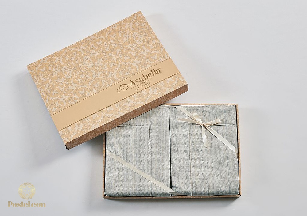 Пододеяльник этого КПБ Asabella застёгивается на молнию, наволочки - с клапаном. Комплект упакован в фирменную подарочную коробку и вложен в фирменный пакет Asabella.