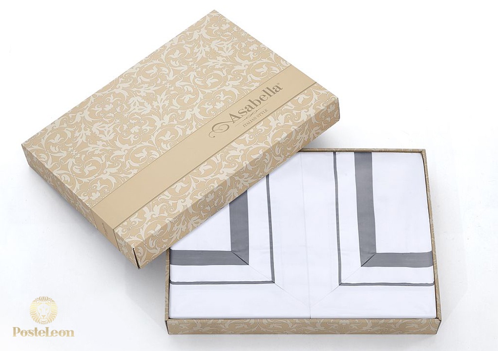 Пододеяльник этого КПБ Asabella застёгивается на молнию, наволочки - с клапаном. Комплект упакован в фирменную подарочную коробку и вложен в фирменный пакет Asabella.