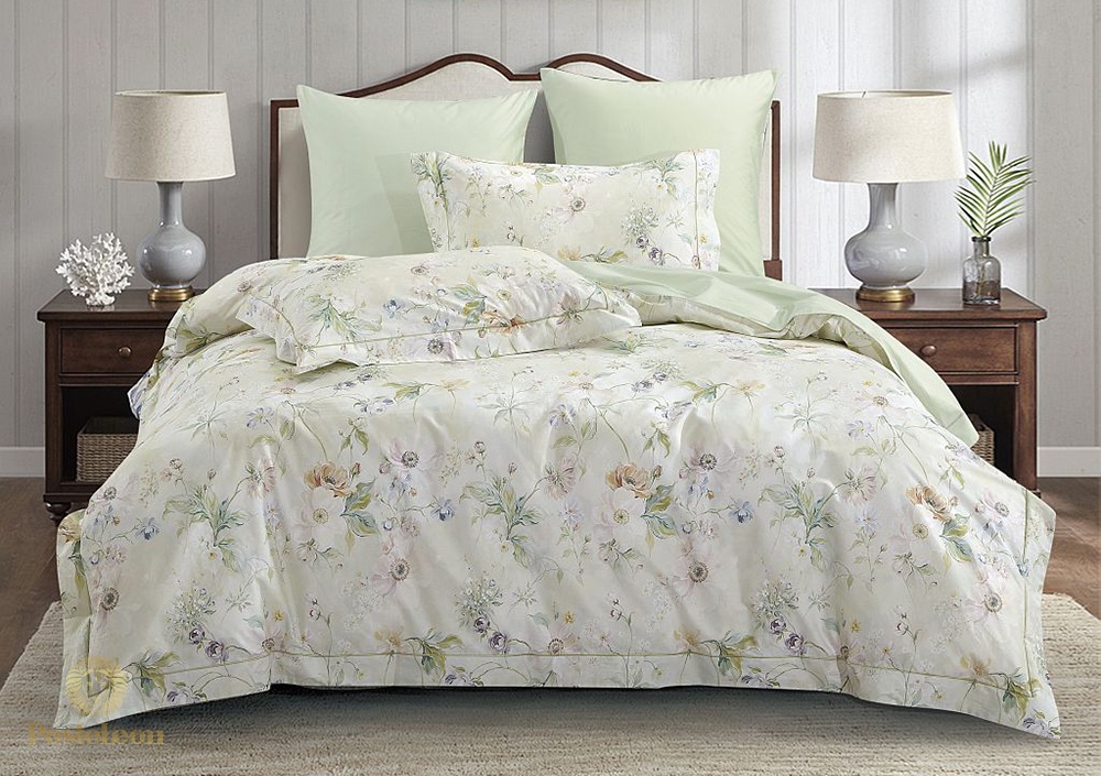 Постельное белье из хлопка-сатина: очень приятный к телу и износостойкий двуспальный комплект. Печатный сатин с новой технологией компьютерной печати, которая не выцветает, не линяет. Дизайн комплекта представляет собой цветы на бледно-зеленом фоне.