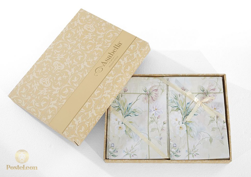Пододеяльник этого КПБ Asabella застёгивается на молнию, наволочки - с клапаном. Комплект упакован в фирменную подарочную коробку и вложен в фирменный пакет Asabella.