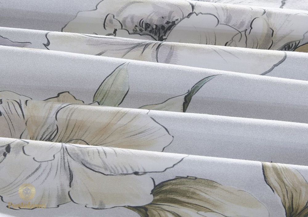 Постельное белье из хлопка-сатина: очень приятный к телу и износостойкий двуспальный комплект. Печатный сатин с новой технологией компьютерной печати, которая не выцветает, не линяет. Дизайн комплекта представляет собой растительный узор на сером фоне.