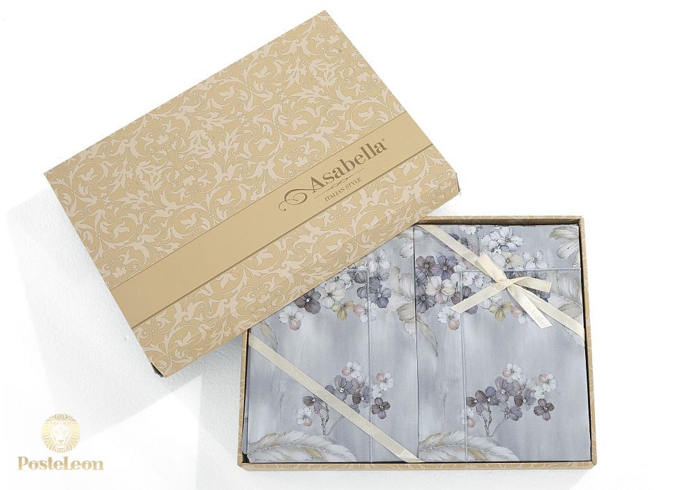 Пододеяльник этого КПБ Asabella застёгивается на молнию, наволочки - с клапаном. Комплект упакован в фирменную подарочную коробку и вложен в фирменный пакет Asabella.