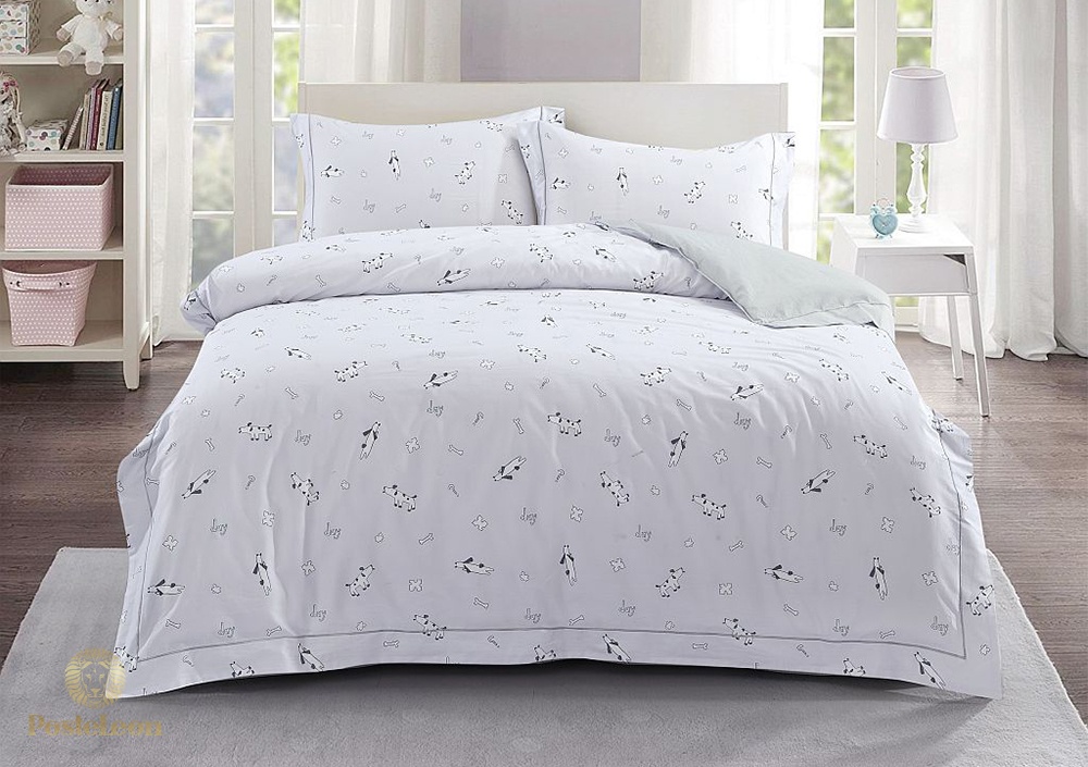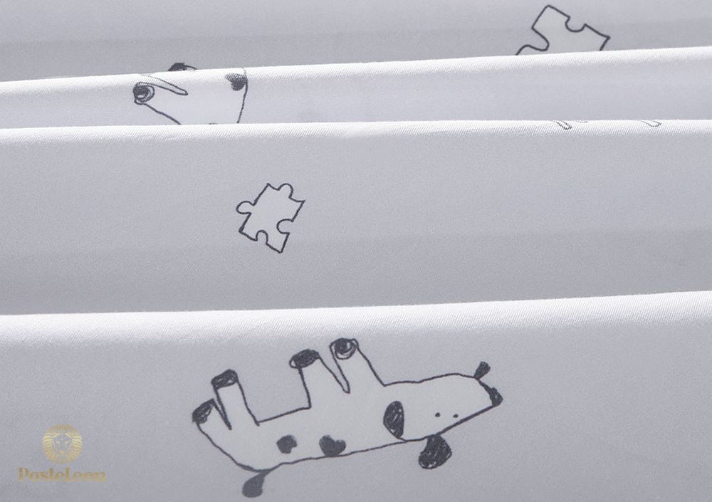 Постельное белье из хлопка-сатина: очень приятный к телу и износостойкий двуспальный комплект. Печатный сатин с новой технологией компьютерной печати, которая не выцветает, не линяет. Дизайн комплекта представляет собой детский рисунок на сером фоне.