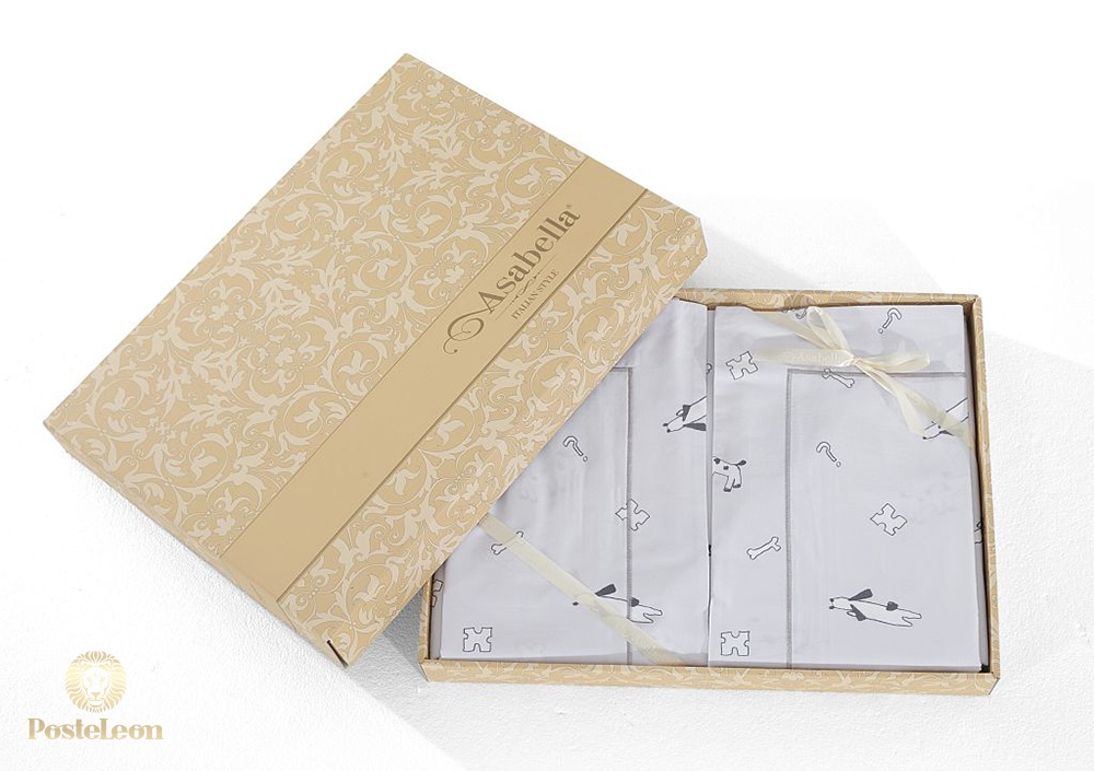 Пододеяльник этого КПБ Asabella застёгивается на молнию, наволочки - с клапаном. Комплект упакован в фирменную подарочную коробку и вложен в фирменный пакет Asabella.