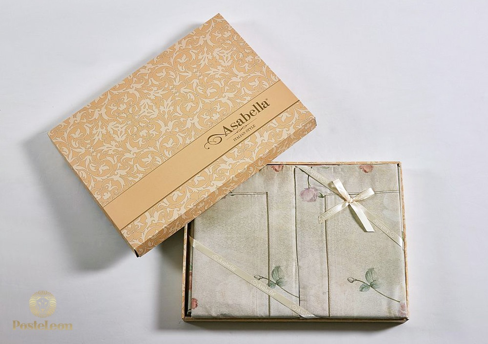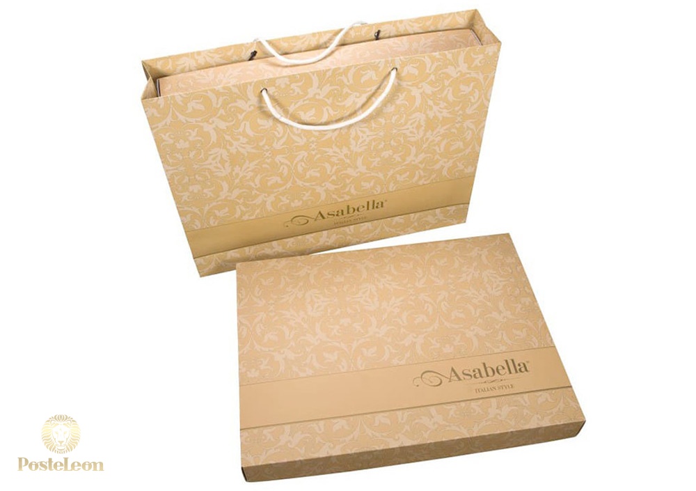 Пододеяльник этого КПБ Asabella застёгивается на молнию, наволочки - с клапаном. Комплект упакован в фирменную подарочную коробку и вложен в фирменный пакет Asabella.