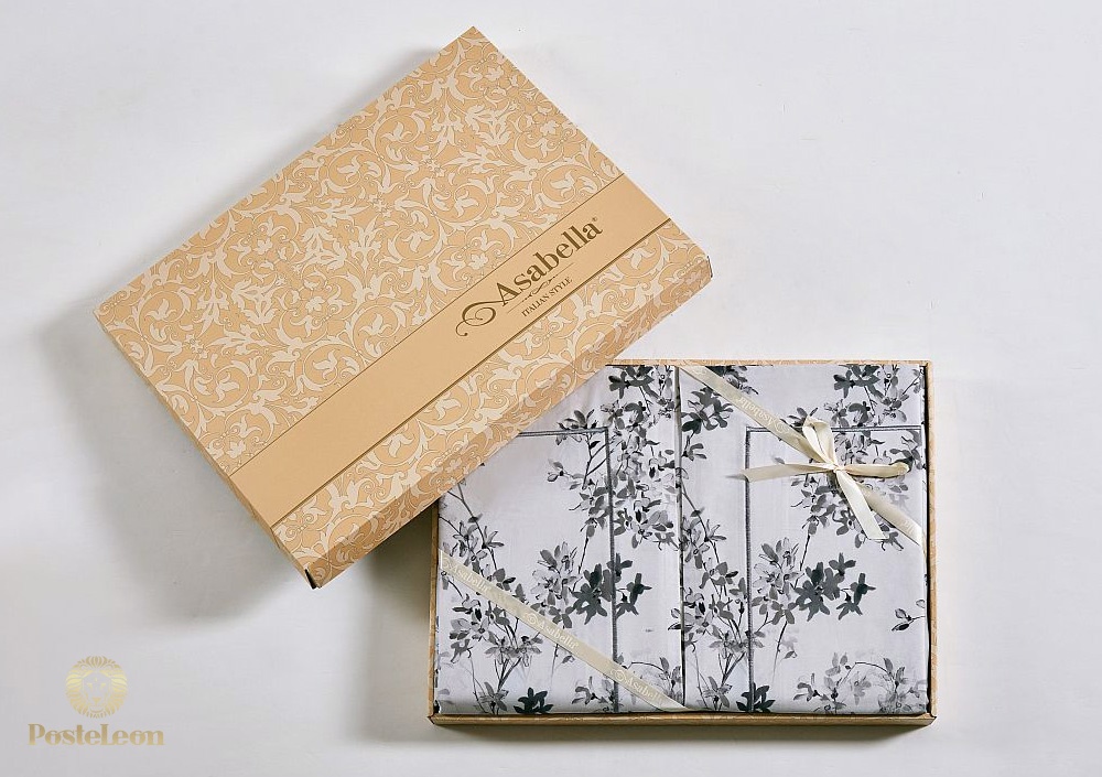Пододеяльник этого КПБ Asabella застёгивается на молнию, наволочки - с клапаном. Комплект упакован в фирменную подарочную коробку и вложен в фирменный пакет Asabella.