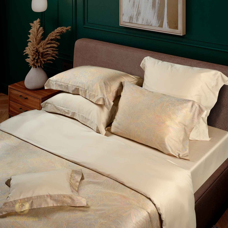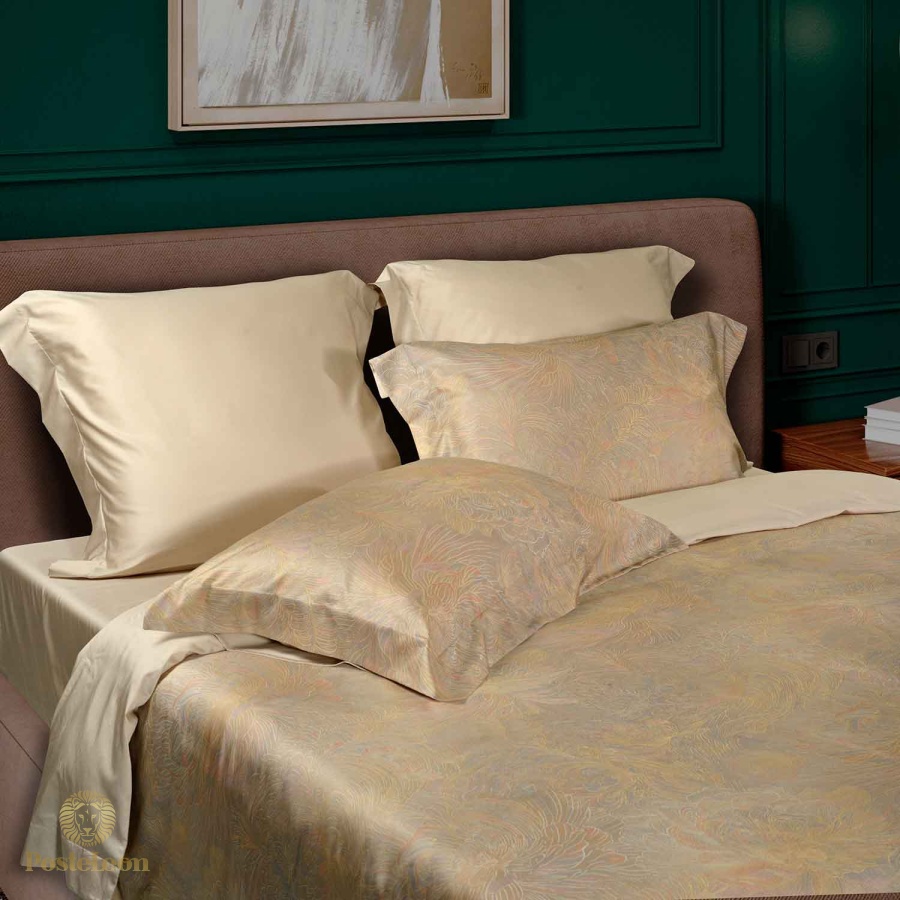 Комплект постельного белья Freya - это настоящая находка для ценителей прекрасного. Лицевая сторона комплекта украшена элегантным золотисто-розовым принтом с изысканным флористическим узором. Обратная сторона и простыня выполнены из бежевой ткани, хорошо гармонирующей с основным мотивом.