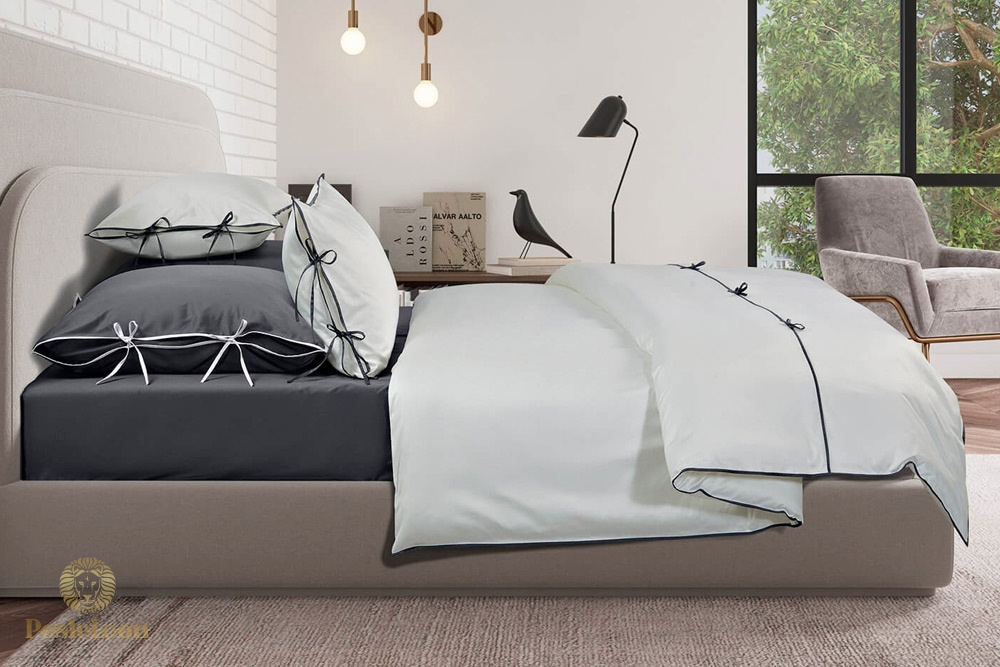 Коллекция Luca — один из хитов однотонного постельного белья. Сочетание бежево-серого с темно-синим или бордовым выглядит очень декоративно, а интересные завязки добавляют одноцветной постели пикантности. Отличное решение для интерьеров в минималистском стиле, лофтов и студий.