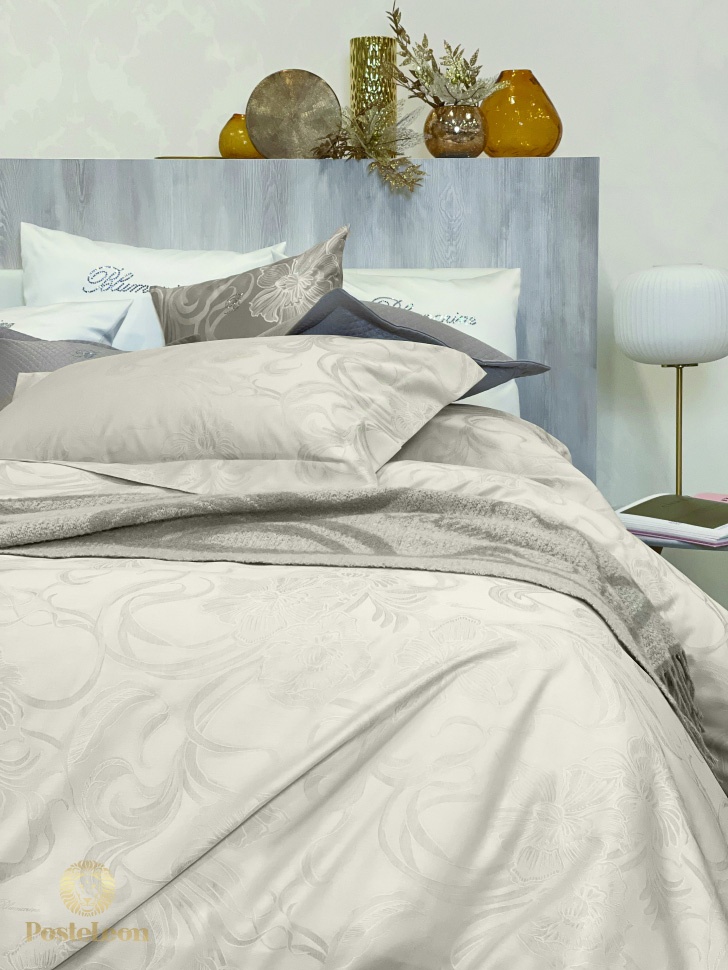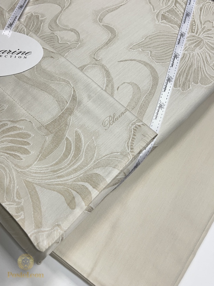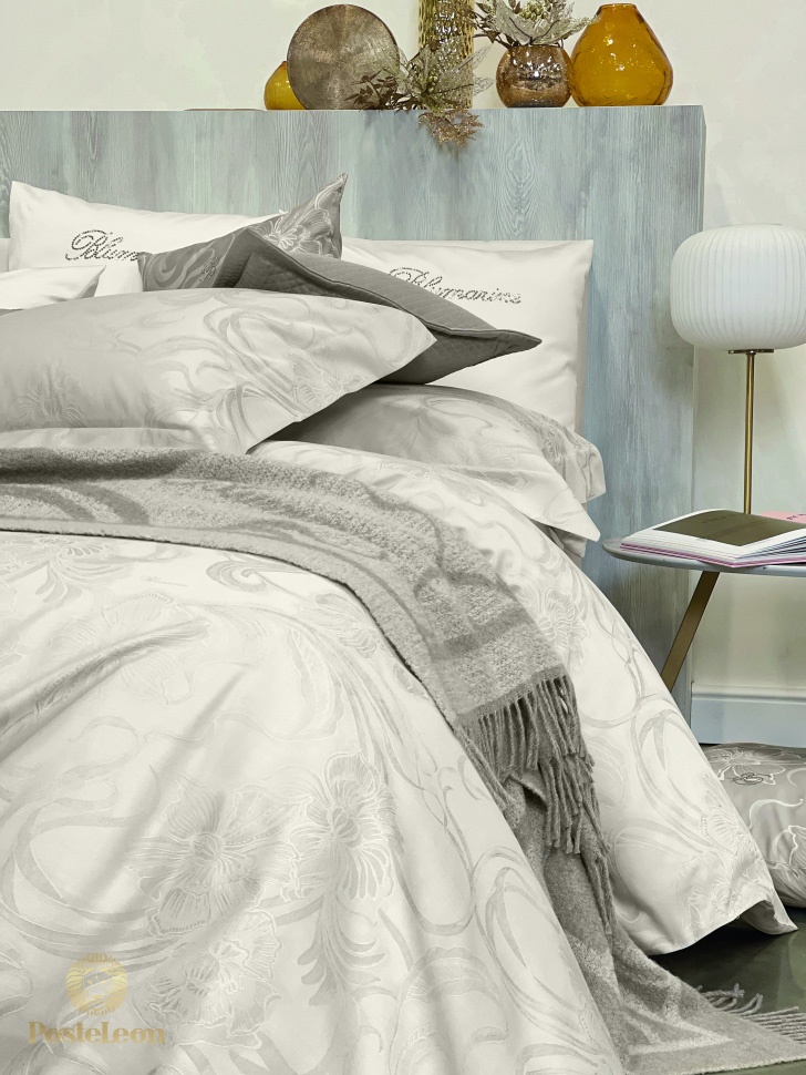 Коллекция осень-зима 2025-2026! Роскошный комплект постельного белья для двуспальной кровати из сатина жаккарда. Пододеяльник и наволочки с лицевой стороной из жаккарда, с напечатанным логотипом Blumarine в узоре и однотонной изнанкой, нижняя простыня из однотонного сатина.